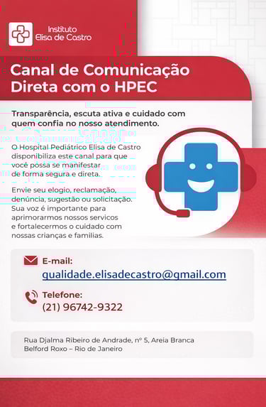 O Instituto Elisa de Castro atua com uma estrutura dividida entre sua sede administrativa, localizada na Avenida Embaixador Abelardo Bueno, 3180, 7 andar - Barra da Tijuca - 22.775-003 - Rio de Janeiro, e seu hospital pediátrico, situado em R. Djalma Ribeiro de Andrade, 5 – Areia Branca, Belford Roxo – RJ, 26112-140. Essa dinâmica permite que as áreas de gestão e atendimento funcionem com foco total em suas responsabilidades.